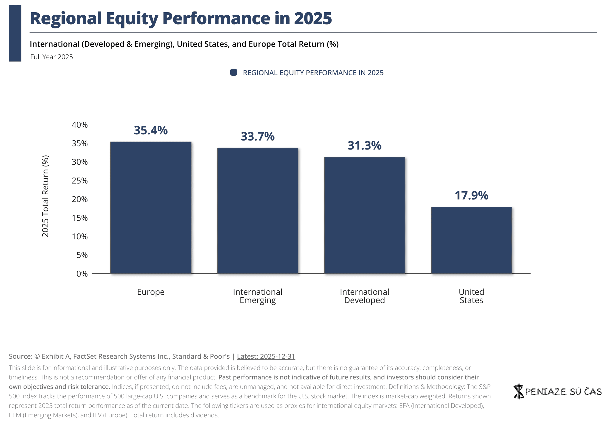 Skrátka, EŮ je ekonomický gigant a mala by sa podľa toho začať správať. Ak by sa to malo udiať, na finančné trhy to však zrejme bude mať negatívny dopad. Dnes El Presidente prilieta do Davosu. Bude zábava. Moje 3 postrehyI. Bitcoin ako istota n neistých časoch? Podľa kryptobros mal byť bitcoin a spol náhradou za nekvalitné papierové peniaze a celý zlý finančný systém. Mal byť bezpečným prístavom. Digitálnym zlatom. Ani v tomto prípade to nevyšlo. Geopolitické napätie od zvolenia Trumpa za US prezidenta stúpa. Zlato reaguje rastom. Akcie kupodivu tiež. Ale Bitcoin? Od dosiahnutia maxím v októbri 2025 spadol o 28% (všetko ostatné rástlo). Od spustenia kauzy "Grónsko" zaznamenal prepad o 7,50%. Bitcoin nie je bezpečným prístavom v čase kríz. II. Osobné financie 101 -Čo s peniazmi v roku neistôt 🔥💰: Skôr než začnete riešiť investovanie, musíte mať pevný základ – hotovostnú rezervu (emergency fund). Je to vaša finančná poistka pred nečakanými situáciami. III. Čakanie na korekciu nie je ideálny spôsob investovania: Investori prišli o oveľa viac peňazí snahou odhadnúť, kedy korekcie prídu a prípravou na ne, než pri korekciách samotných. Peter Lynch 2 zaujímavé články odinakiaľVäčšinu US ciel zaplatili US spotrebitelia Samozrejme. Analýza Kiel inštitútu ukazuje, že až 96% US ciel zaplatili domáci spotrebitelia Dychberúci rozsah výstavby obnoviteľných zdrojov energie v Číne Minulý rok Čína vybudovala viac ako polovicu globálnych veterných a solárnych zdrojov energie. Len v máji nainštalovala kapacitu pokrývajúcu ročnú spotrebu energie Poľska. 1 graf na tento týždeňAko sa darilo globálnym akciám v roku 2025. US akcie dosiahli slušný výnos takmer 18% (v USD). Bol to však najhorší výsledok. Všetko dobré, Vladimír |